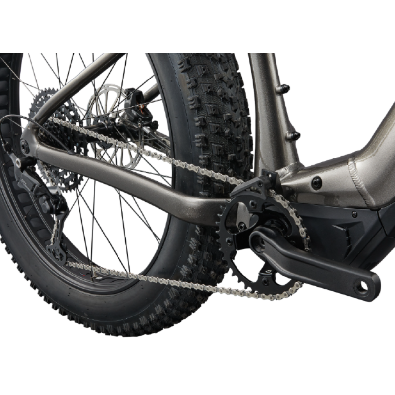 Vee Tire Co. Avalanche 27.5×4.5″ dekk er slangeløse og klargjort for pigger, noe som gir overlegent grep på snø og is. Shimano Cues LinkGlide 10-delt drivverk med 11–48T kassett og KMC e-optimalisert kjede gir slitestyrke og stabil giring under høyt dreiemoment.