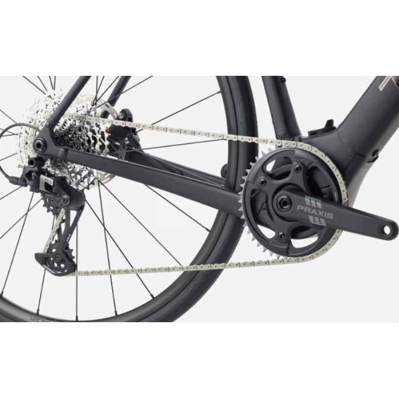 Drivverket består av SRAM Apex XPLR 1×12, med bred utveksling (11–44T) og presise, rene girskift. Hydrauliske SRAM Apex D1 skivebremser gir trygg og kontrollert nedbremsing – uansett vær og underlag.Med plass til opptil 40 mm dekk (35 mm med skjermer) fungerer Domane+ ALR 5 også glimrende på grus. Den kan dermed være både din treningssykkel, langturssykkel og lett gravelsykkel i én og samme pakke.