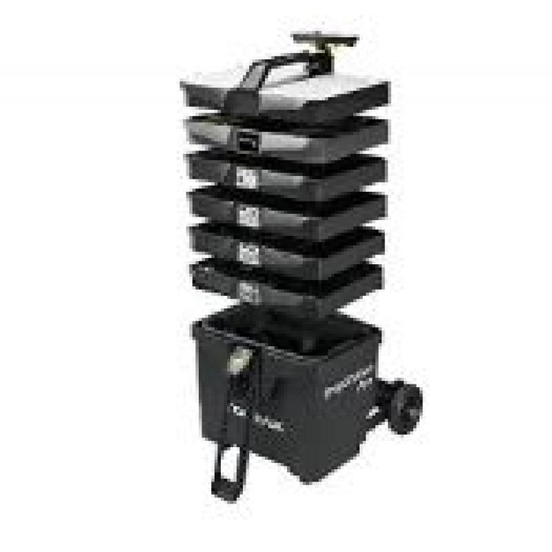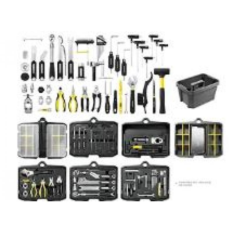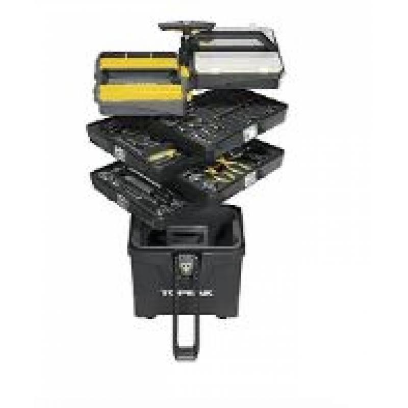 Proff verktøystasjon på hjul med syv rom fylt med 55 verktøy (85 funksjoner). Uttrekkbar hjulbase gir stabilitet, og Push Button Lift Handle åpner skuffene raskt. Kan låses med hengelås. Perfekt for verksted eller ritt.
