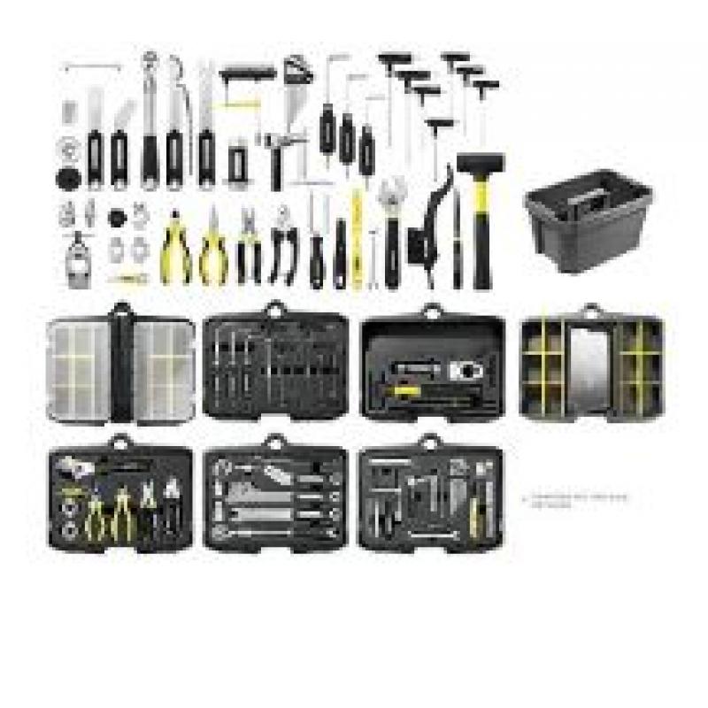 Proff verktøystasjon på hjul med syv rom fylt med 55 verktøy (85 funksjoner). Uttrekkbar hjulbase gir stabilitet, og Push Button Lift Handle åpner skuffene raskt. Kan låses med hengelås. Perfekt for verksted eller ritt.
