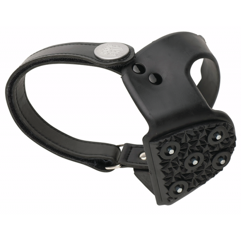 Vår hælbrodd er utstyrt med 5 innstøpte tungsten pigger. Den er både rask og enkel å ta av-og-på og festes godt med borrelås over skoen.