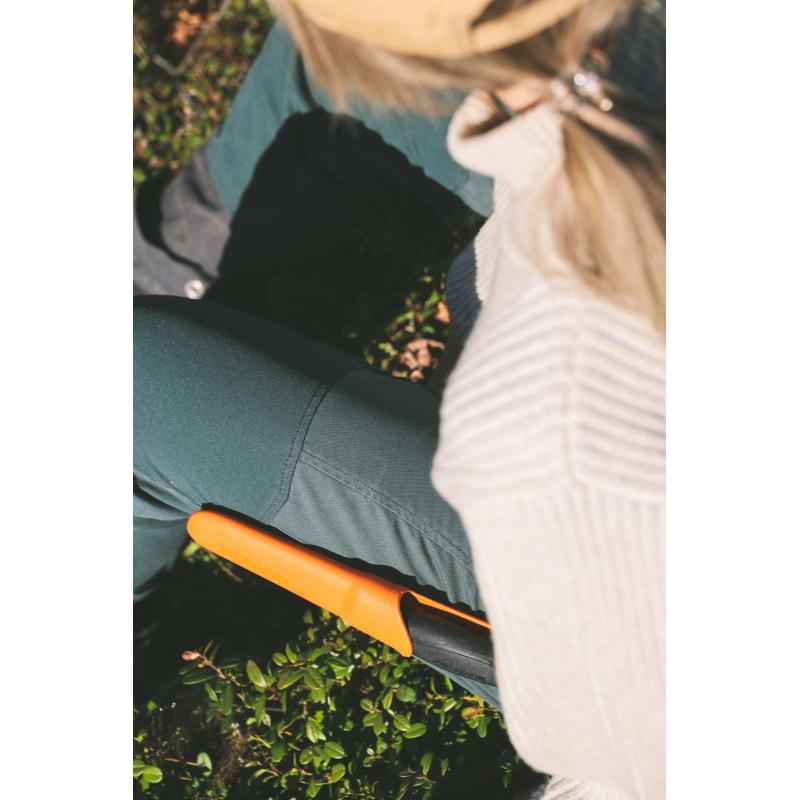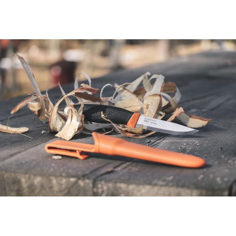 Det ergonomiske skaftet av polymer har et mykt friksjonsgrep, fingerbeskyttelse og et 2,5 mm tykt blad av resirkulert svensk rustfritt stål, som gir både styrke og stabilitet i hvert kutt. Takket være blad- og skaftkonstruksjonen, er kniven optimal for trygg og effektiv bruk under ulike værforhold hele året. Knivsliren i polymer har en praktisk belteklips slik at kniven kan festes til beltet eller ryggsekken, alltid for hånden.